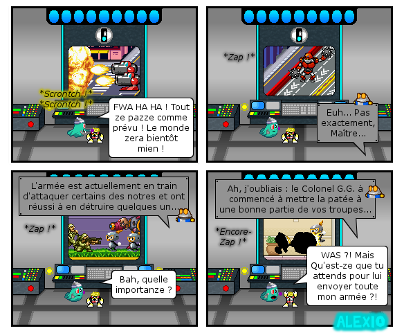En fait, le but de ce gag était de se moquer du fait que si son armée se fait attaquer par une autre armée, en général, il s'en préoccupera pas (vu qui là latte tout l'temps). Par contre, quand il s'agit d'un seul gars, le héros en l’occurrence, là, il envoie toute ses effectifs pour lui éclater la tronche.LF1 a écrit :Je trouve que les répliques des deux dernières cases (de ton dernier gag) manquent d'impact pour créer un véritable contraste humoristique.